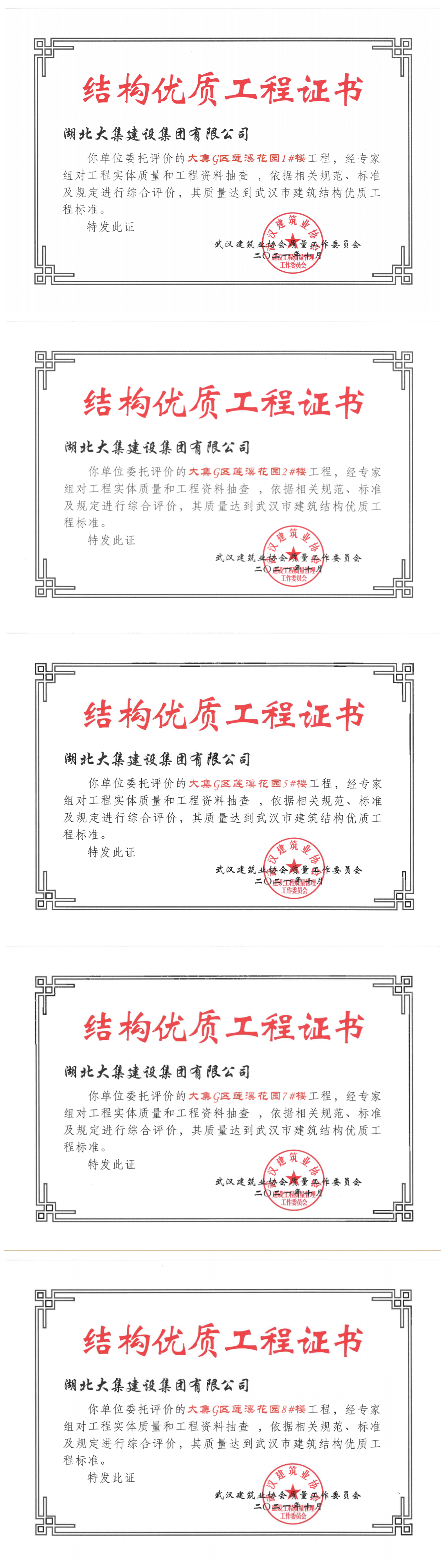 近日,由湖北大集建設集團承建的大集G區(qū)蓮溪花園項目1#、2#、5#、7#、8#樓榮獲“武漢市建筑結構優(yōu)質工程”榮譽。