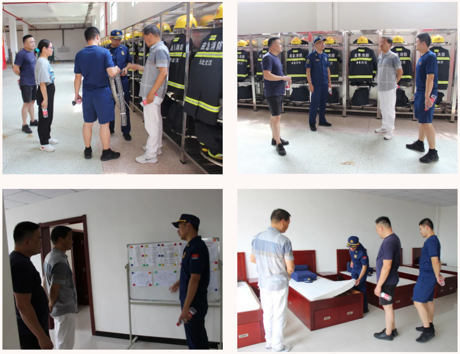 大集消防救援站教導(dǎo)員盧志帶著大家參觀(guān)了消防裝備庫(kù)及消防官兵備勤室,參觀(guān)中,集團(tuán)公司副總經(jīng)理徐家富與盧教導(dǎo)員進(jìn)行了深入交流,詢(xún)問(wèn)官兵們的日常生活及工作情況,并向高溫下堅(jiān)持訓(xùn)練、持續(xù)工作的他們表示敬意。