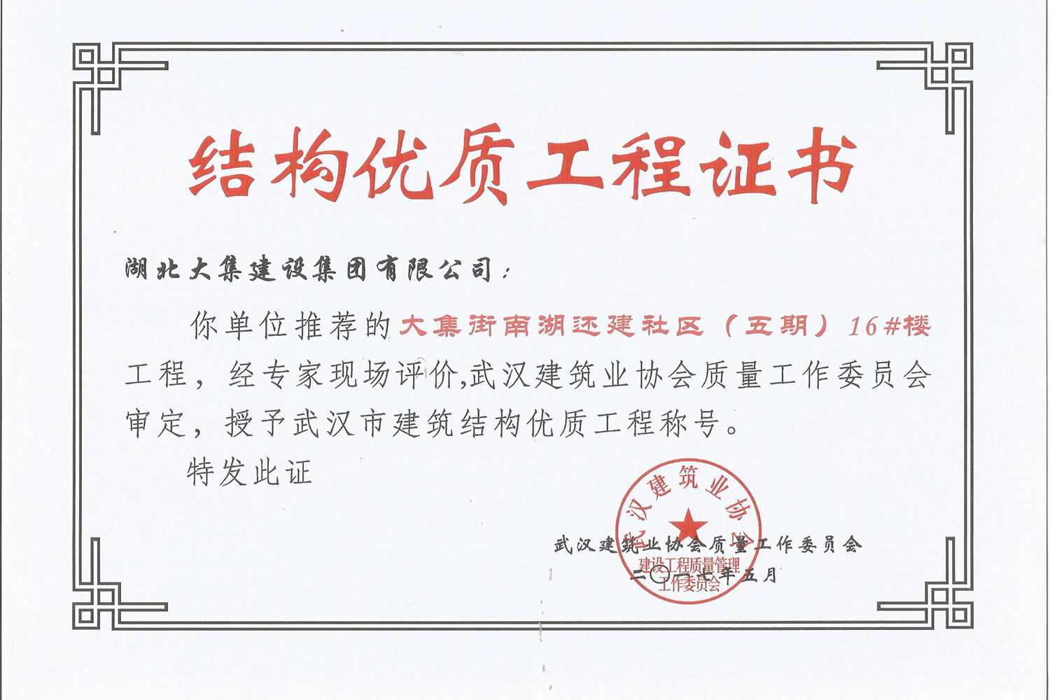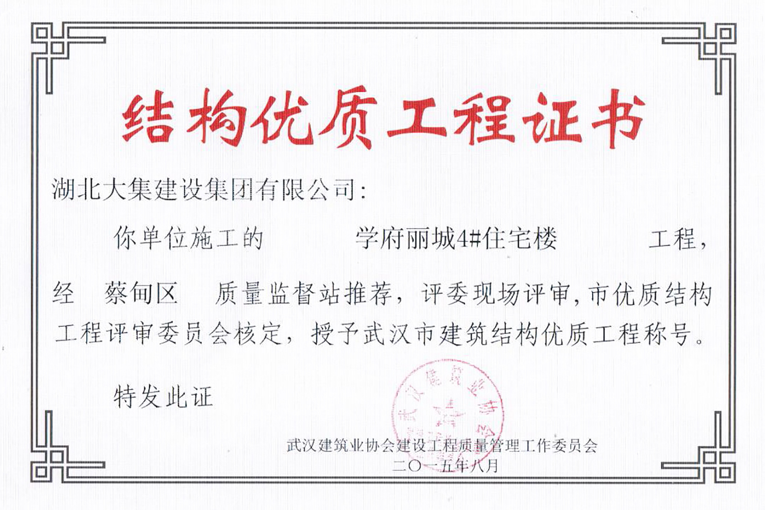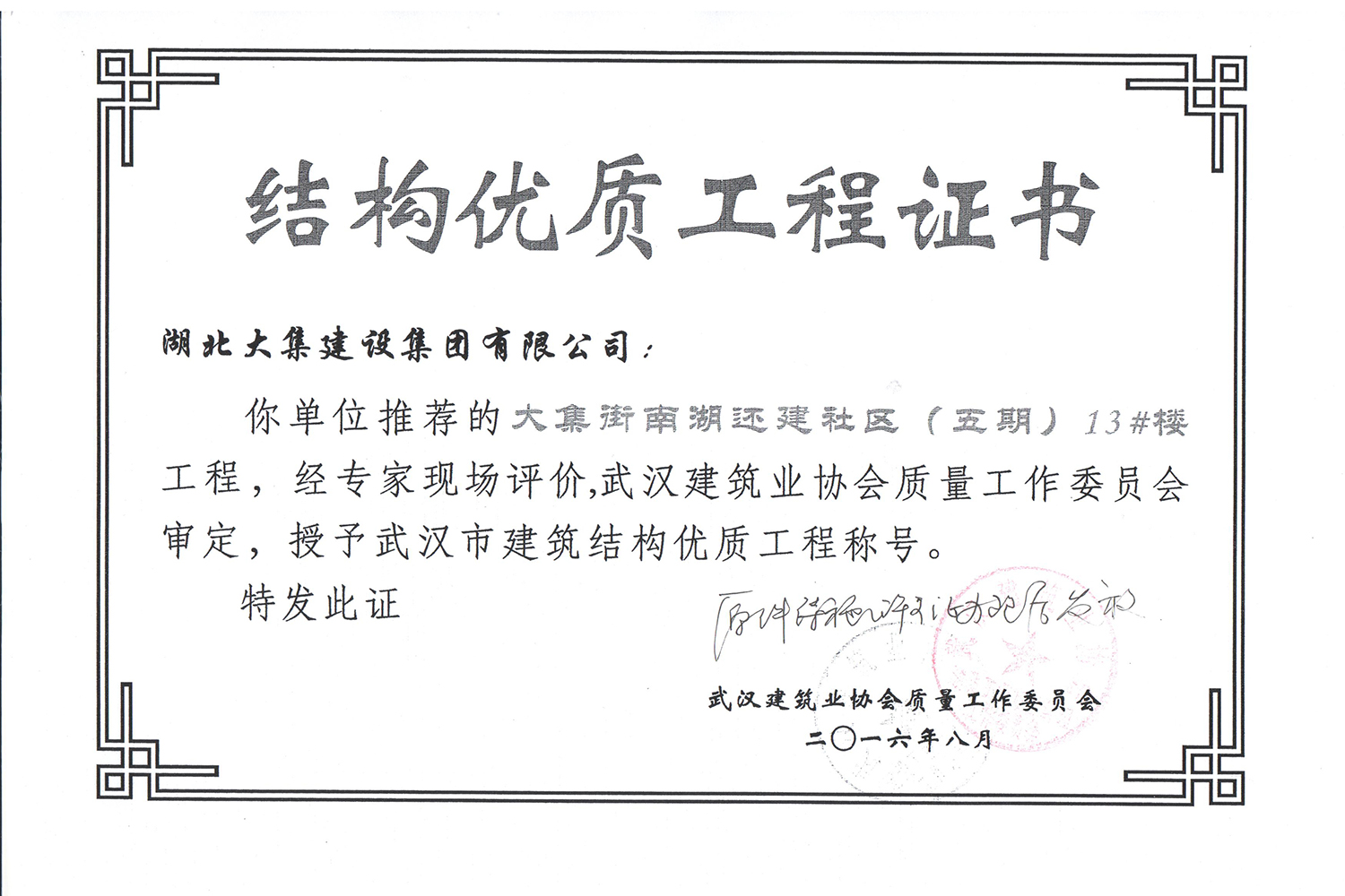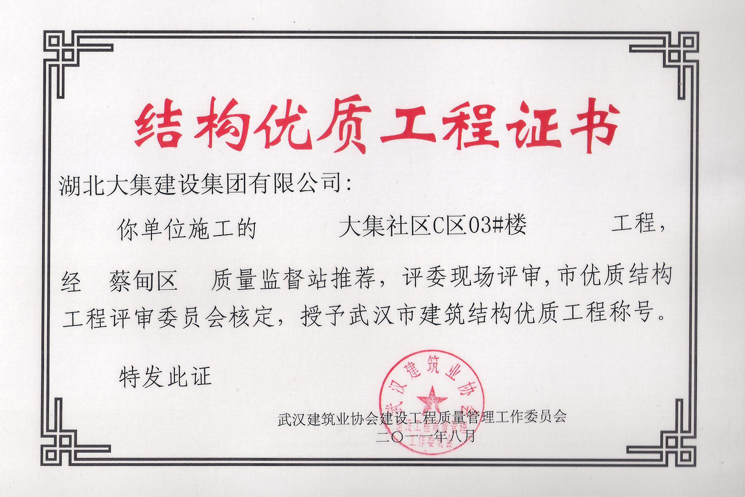 集團秉持“安全是紅線,質(zhì)量是品牌,文明施工是形象”的企業(yè)宗旨,不斷加強全面管理,注重提高自身素質(zhì),以完美的履約、優(yōu)良的質(zhì)量、滿意的服務(wù),贏得了信譽。近年來,湖北大集建設(shè)集團先后與中石化集團、中鐵上海工程局、中建八局、中鐵十二局、碧桂園集團、世茂集團、綠地集團等央企、國企、地方標志性建設(shè)單位合作,先后承建了“碧桂園知音豪庭”項目、“碧桂園光谷云境”項目、“大集G區(qū)蓮溪花園”項目等多個高層住宅小區(qū);承建了世茂龍灣46#、47#、48#地塊、花博匯桃李春風(fēng)二期等多個精品高端別墅群項目;承建了“南湖中學(xué)”、“南湖小學(xué)”、“南湖幼兒園”、“博奧幼兒園”等多個教育配套項目;承建了“孝感英眾超算終端科技產(chǎn)業(yè)園”、“鴻盛華全球航空服務(wù)產(chǎn)業(yè)園”、“盟盛汽車產(chǎn)業(yè)園”、“中原印務(wù)晶毅”等多個具有特殊設(shè)備安裝需求的鋼、混結(jié)構(gòu)工業(yè)廠房項目;承建了“常福商務(wù)廣場”等大型商業(yè)綜合體;承建了后官湖綠道二期、三期,常貴路西延伸段、黃星大道等多條大型道路市政項目;自主開發(fā)了“聚盛晶尚”住宅項目,改善人居環(huán)境,引領(lǐng)綠色棲居新領(lǐng)域;所有工程嚴格執(zhí)行施工作業(yè)全過程質(zhì)量、安全管理,多個項目被省、市級監(jiān)管單位授予“省結(jié)構(gòu)優(yōu)質(zhì)”、“省安全文明施工現(xiàn)場”、“市結(jié)構(gòu)優(yōu)質(zhì)”、“市安全文明施工示范項目”、“樣板工地”等榮譽稱號。
