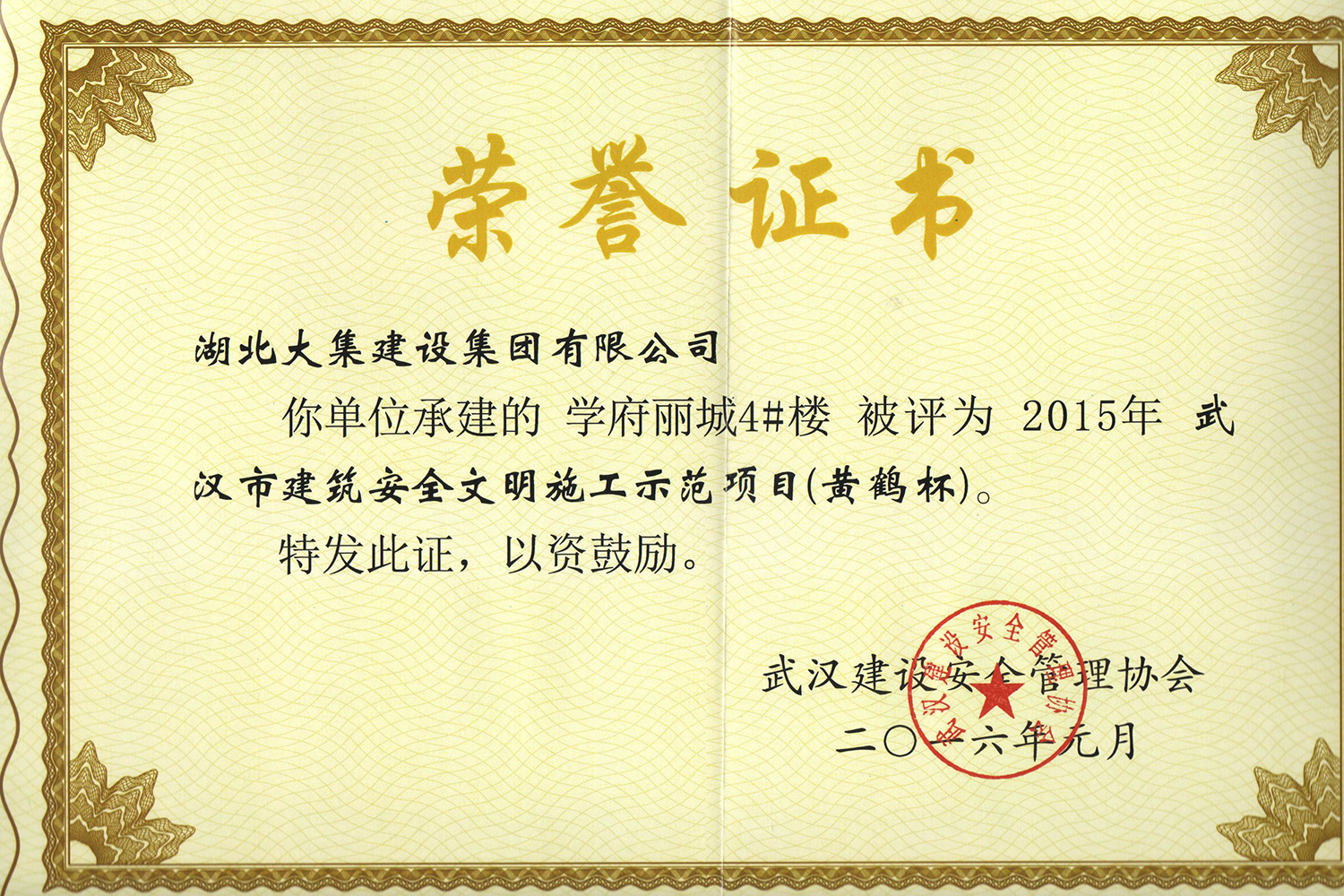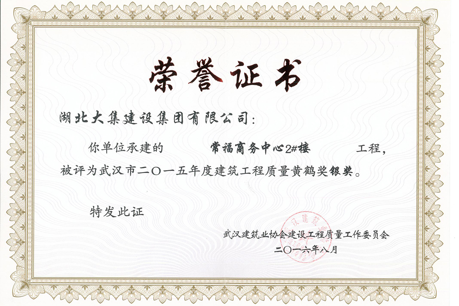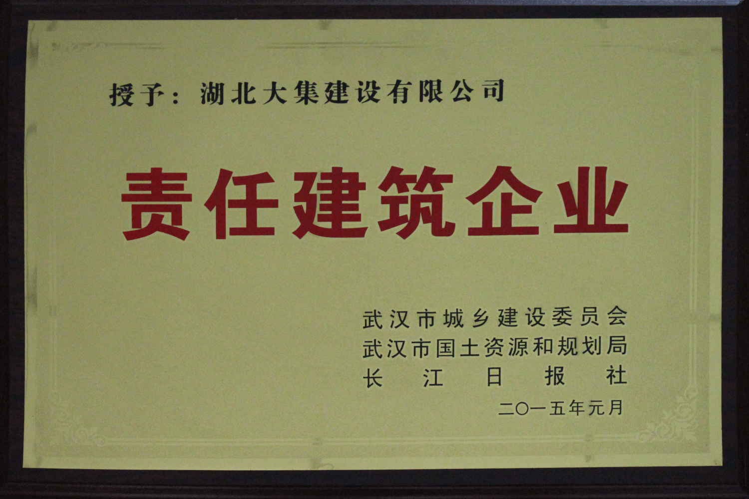 集團在發(fā)展壯大的同時,堅持守法經(jīng)營、依法納稅,堅持履行社會責(zé)任,多年來積極投身社會公益事業(yè)。省、市、區(qū)行業(yè)主管部門連續(xù)多年授予公司為“武漢地區(qū)建筑業(yè)AAA信譽企業(yè)”、“武漢地區(qū)建筑業(yè)優(yōu)秀企業(yè)”、“武漢市最具成長性民營建筑企業(yè)”、“勞動保障守法誠信A級單位”等榮譽,多次被省、市工商局評為“守合同重信用”企業(yè),多年被地方政府授予“納稅貢獻獎”。