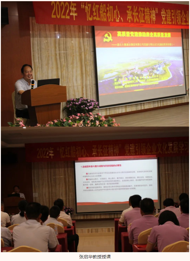接著,湖北省委講師團(tuán)基層理論宣講員張啟華教授以“高質(zhì)量黨建推動企業(yè)高質(zhì)量發(fā)展”為主題進(jìn)行授課。張教授從“苦難與輝煌”、“消失與崛起”、“巨變與挑戰(zhàn)”、“經(jīng)驗(yàn)與啟示”、“輝煌與蝶變”五個方面分別講述了中國共產(chǎn)黨的百年奮斗史、跌宕起伏中國房企十年之變、房企掌舵者眼中的2022年、紐約灣區(qū)發(fā)展成為世界級灣區(qū)的原因以及高科技贏在新時代的內(nèi)容,并在講解中融入了湖北大集建設(shè)集團(tuán)和武漢閱景匯兩家公司的發(fā)展歷程,讓大家對中國共產(chǎn)黨的發(fā)展、公司的發(fā)展以及個人的發(fā)展有了更加清晰的認(rèn)識以及深刻的反思。